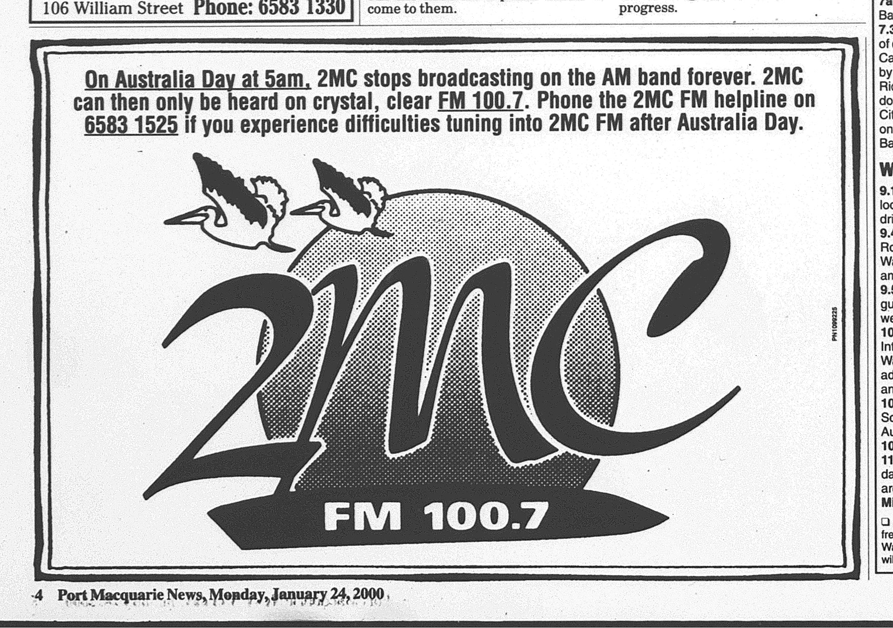 And just 2 days later (26/1/2000), 2MC also moved it’s brand to a new commercial FM licence (with callsign of 2PQQ) with Easy listening taking the old 2MC AM frequency.