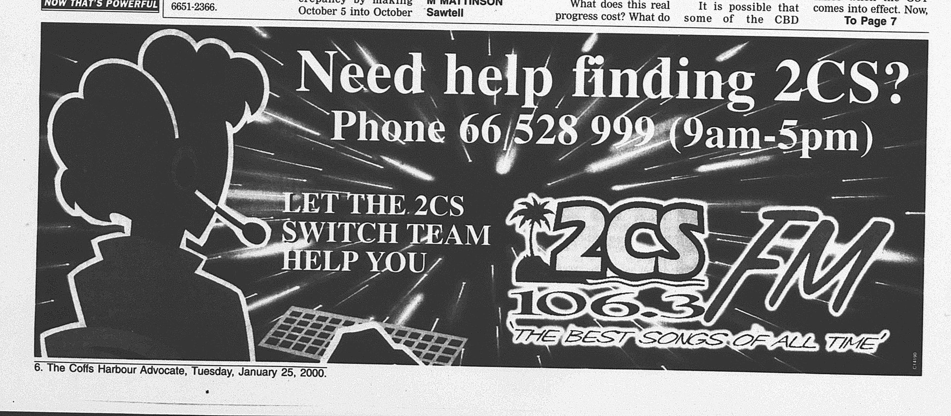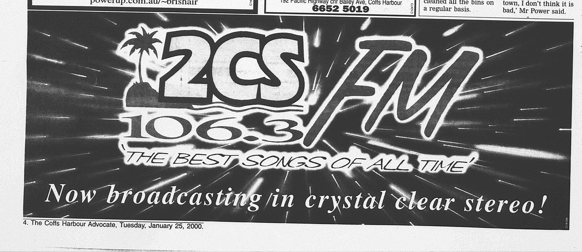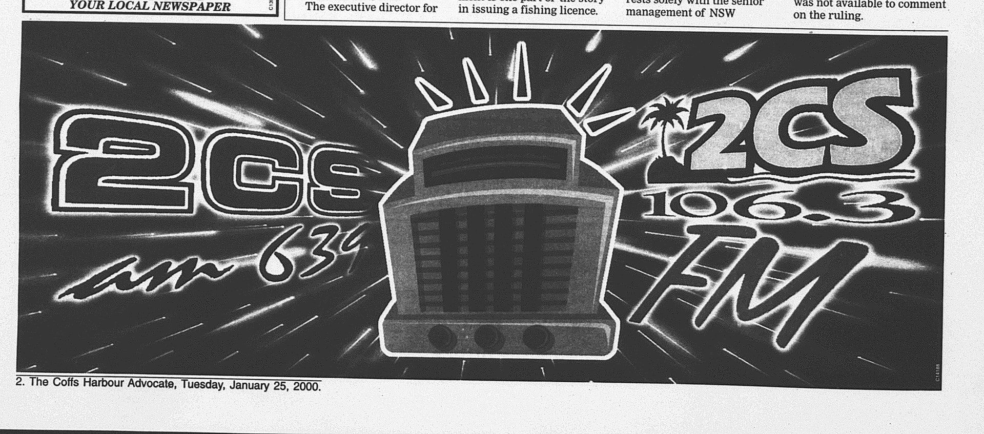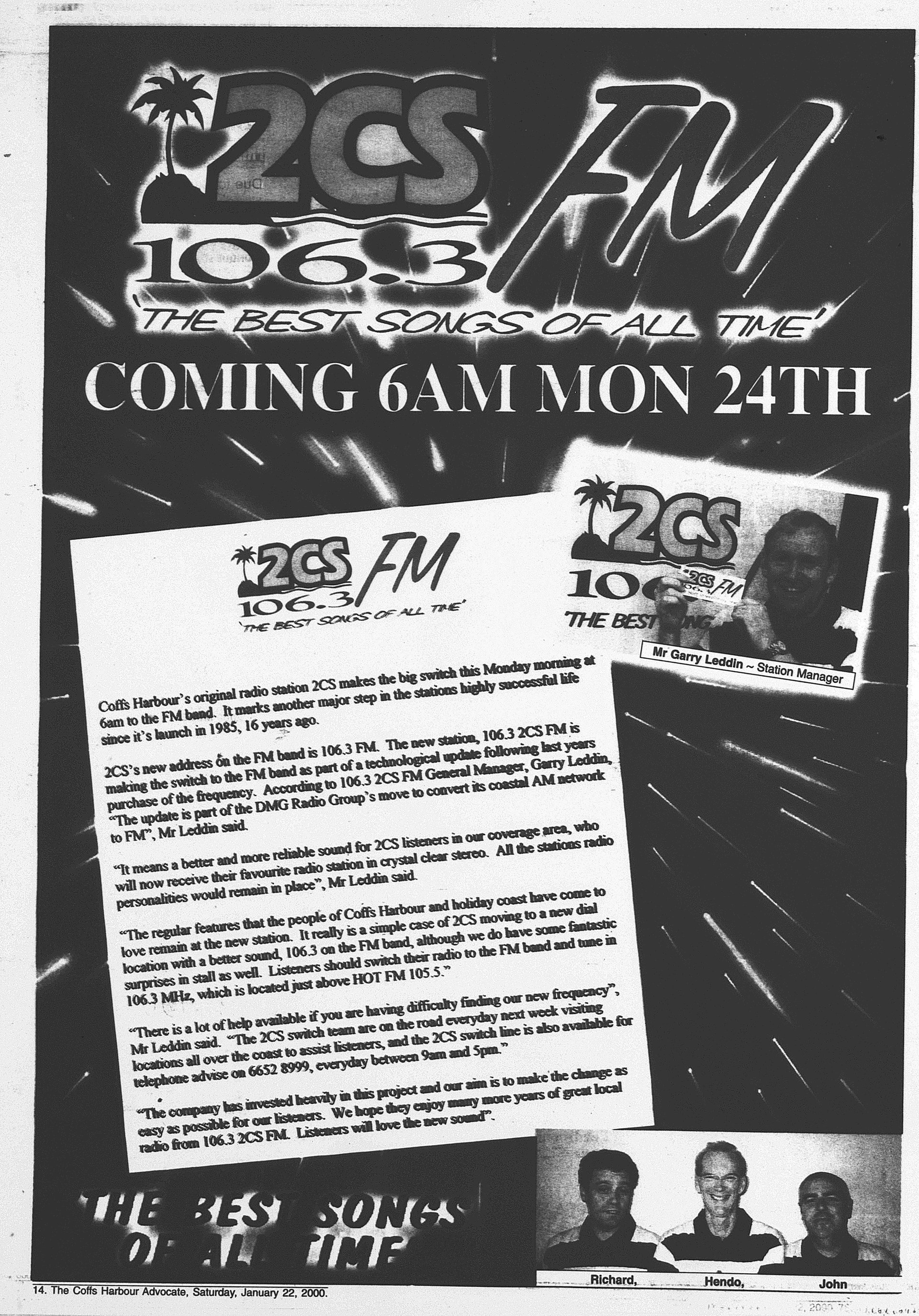January 2000 was an exciting time on the Mid North Coast of NSW… with 2CS Coffs Harbour moving it’s brand to a new licence on 106.3 (with 2CFS as the new callsign) on Monday 24 January … And 639AM taking over the old 2CS AM licence
