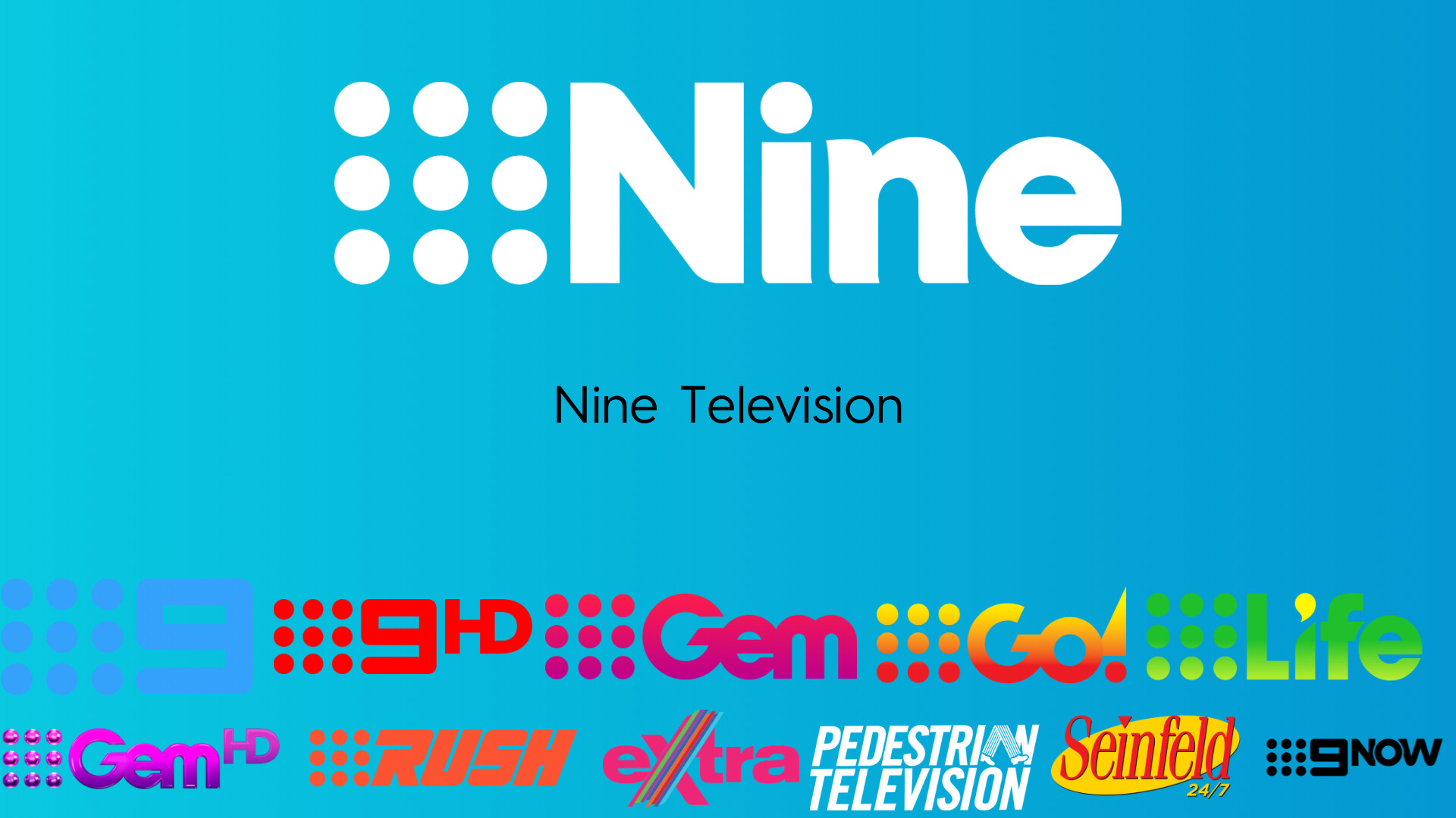 I have done a mock related to Nine’s television division, ahead of Nine’s relaunch, with a background similar to the 9Now app. It includes Nine’s free-to-air channels and 9Now’s FAST channels, Pedestrian Television and Seinfeld 24/7. The mock has logos that are all flat, except for 9GemHD, which has a glossy logo, because I could not find a flat logo for that channel.