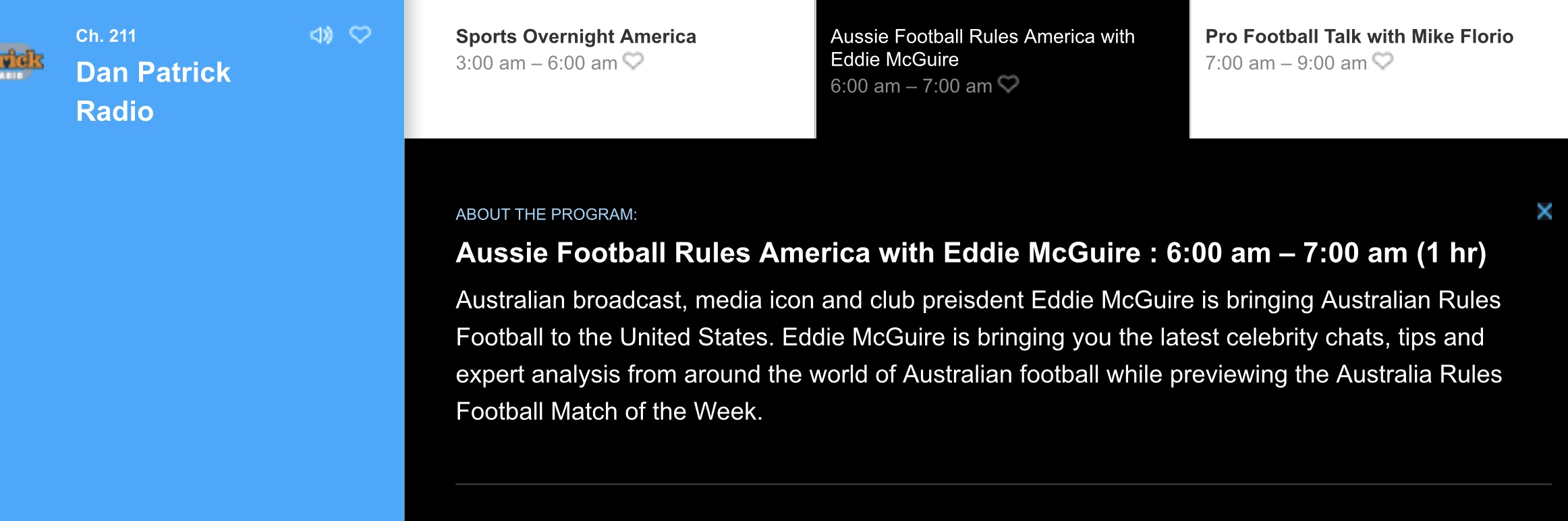 With AFL and NRL Finals on right now, I had a look to see if thereās any live coverage on Sirius XM, there isnāt, but I spotted this packaged show.