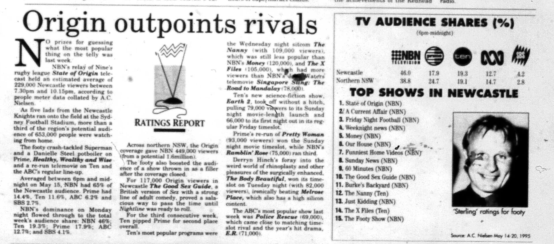 This ratings report from 1995 showed how Prime and NRTV/Ten struggled to get any real foothold in the Newcastle market, with only the occasional 7 / 10 program making the Top 15 .. these shares didn’t change much at all during the 90s or even the 00s.