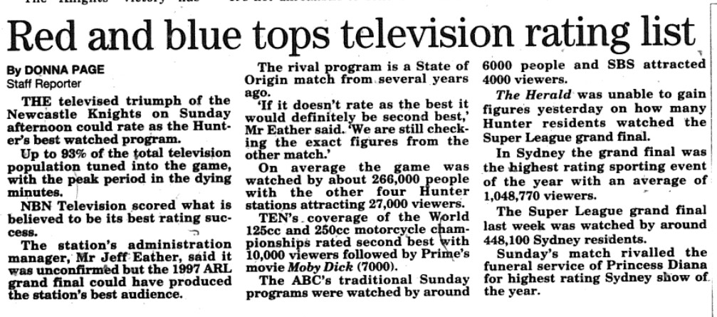 The Newcastle Knights maiden 1997 Grand Final win attracted 93% of the available Newcastle area viewing audience! (nb it was still a daytime Grand Final then).