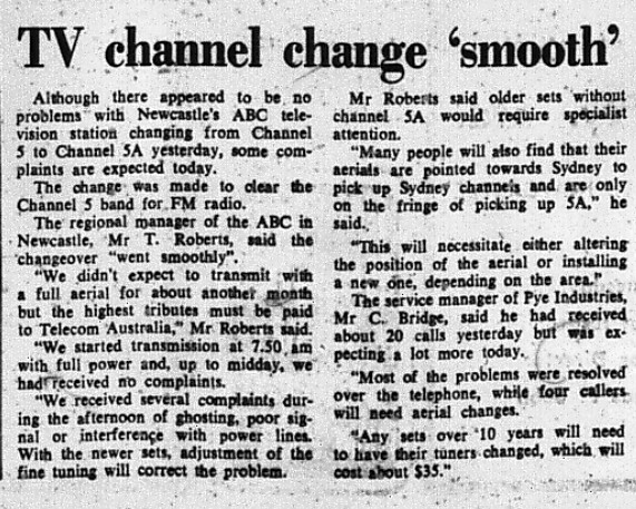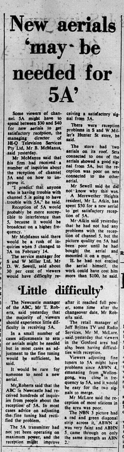The date ABHN-5 (ABC TV Newcastle) changed to Channel 5A… there didn’t seem to be a whole lot about in the Newcastle Herald.. I guess for most, all it meant was turning the rotary channel knob on the TV around one more position (as push button TVs I think were still a few years away ??), though some on the fringes might require a different antenna.