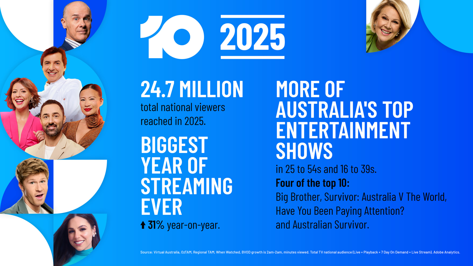 In 2025, 10 remained TV’s youngest network, delivered record-breaking streaming growth, secured more of the top entertainment shows in 25 to 54s and 16 to 39s, and reached 24.7 million Australians.