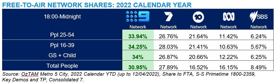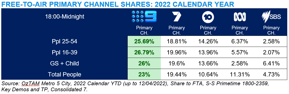 At a primary channel level, Channel 9 is also leading both the calendar year and survey year with all key demos and Total People.