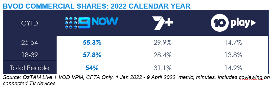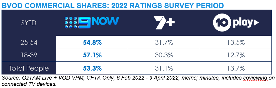 In the BVOD space, 9Now is the No. 1 commercial free-to-air (CFTA) BVOD platform, winning every survey week of the year so far. 9Now is leading the survey year-to-date (SYTD) on minutes streamed with Total People, as well as the key demos 25-54 and 18-39.