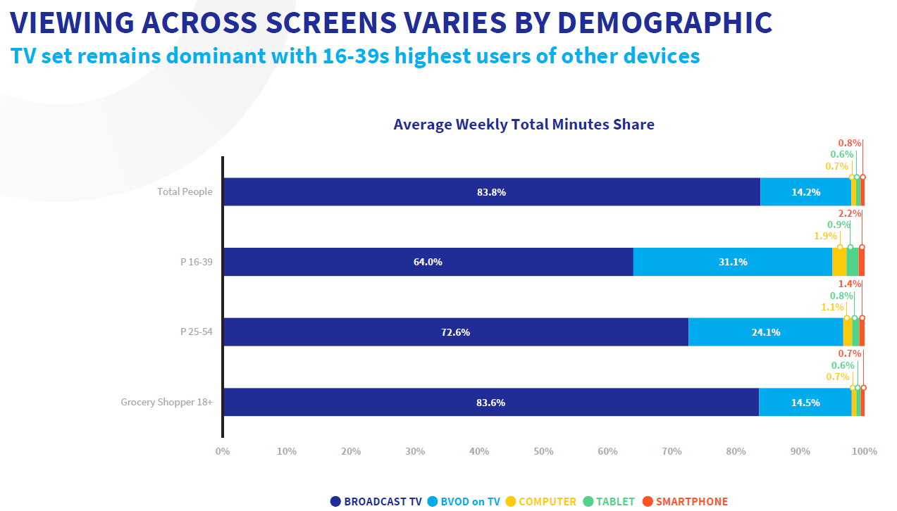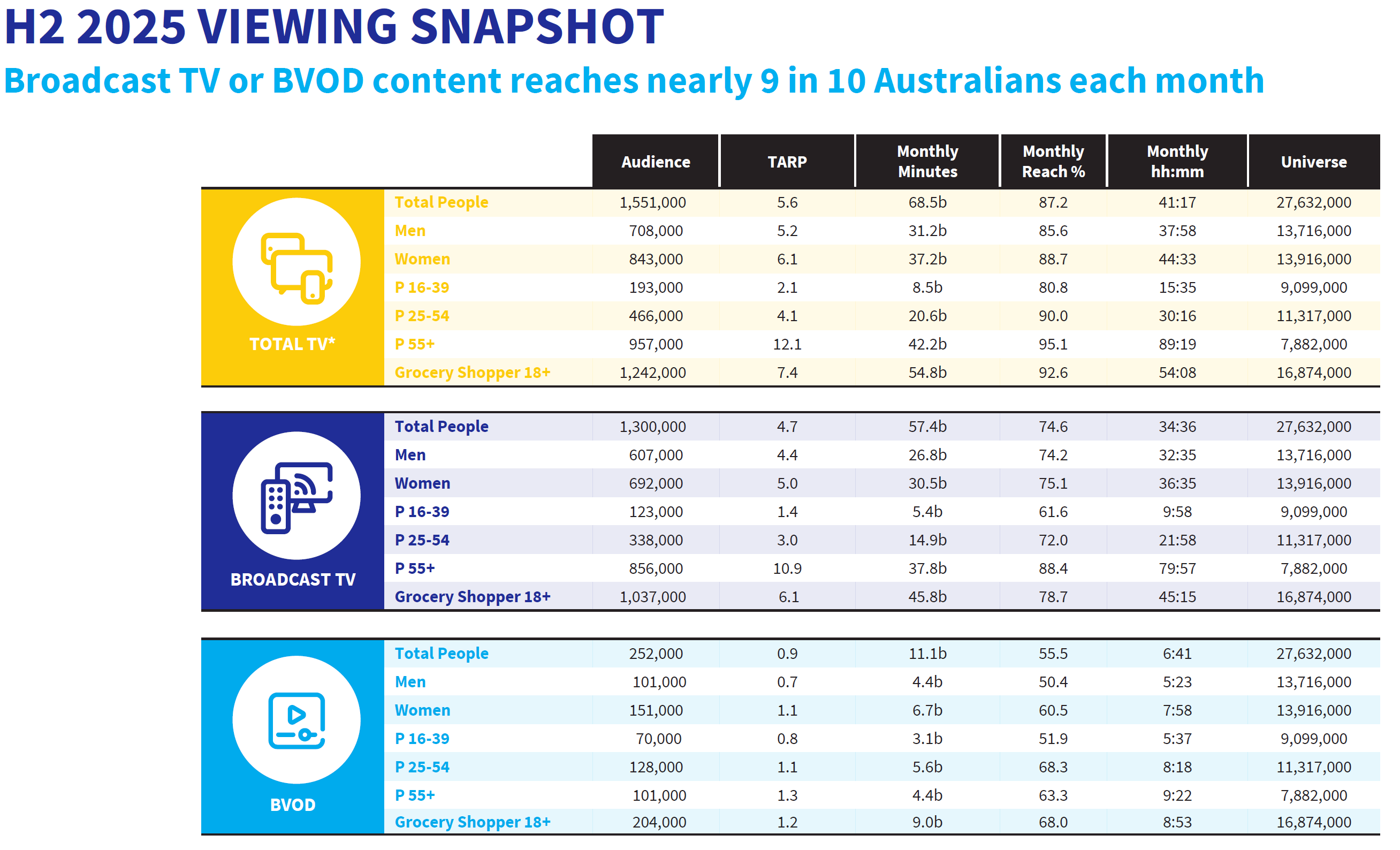 Broadcast TV and BVOD together reached 87.2% of Australians on average each month in H2 2025. Among Grocery Shoppers 18+, this increases to 92.6%.