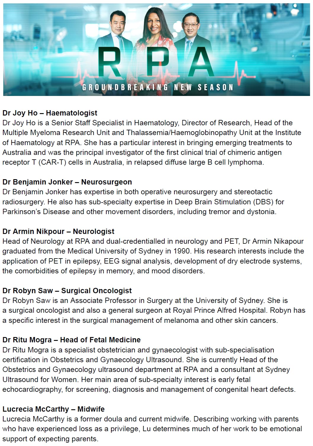 In this episode, world-leading pathologist Dr Richard battles his own mortality with a ground-breaking trial. Joseline, receives a long-awaited liver transplant and in the ER, Grace’s adventurous spirit has led her to a badly broken ankle.