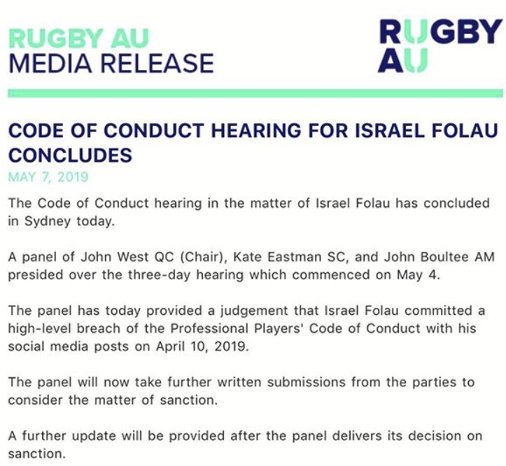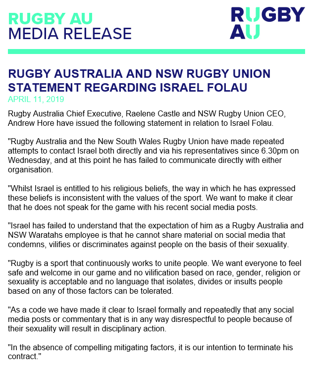 Israel Folau has been sacked. He can however lodge an appeal within the next 48 hours if he chooses to.