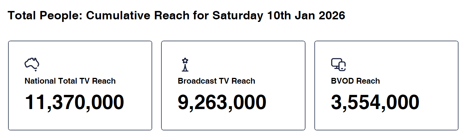 United Cup Night that saw Poland defeat USA was just beaten with 316k while the Magic Millions Night on Seven had 220k. That compares to Seven’s inaugural night racing broadcast in 2025 that had 285k.