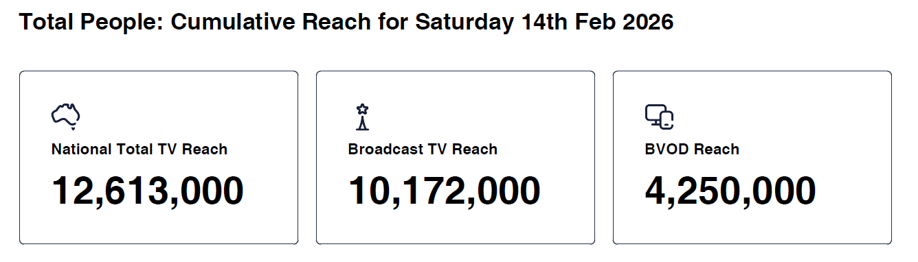 Winter Olympic Games 2026 Night Session 2, Day 8 (21:00-22:30) – was Australia’s No. 1 program of the night with Total People by reach across Australia. It was also the No.1 non-news program of the night with Total People and GS18+ and the No. 1 program of the night with People 25-54 across Australia. It secured a National Total TV Reach of 2.002 million , a Total TV National Audience of 946,000 and a BVOD audience of 129,000 .