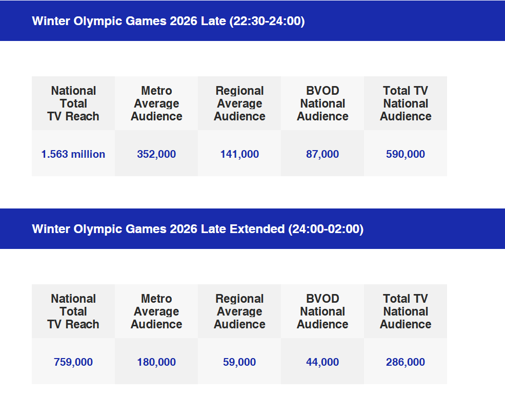 Winter Olympic Games 2026 Late Extended, Day 8 (24:00-02:00) – registered a National Total TV Reach of 759,000 , a Total TV National Audience of 286,000 and a BVOD audience of 44,000 .