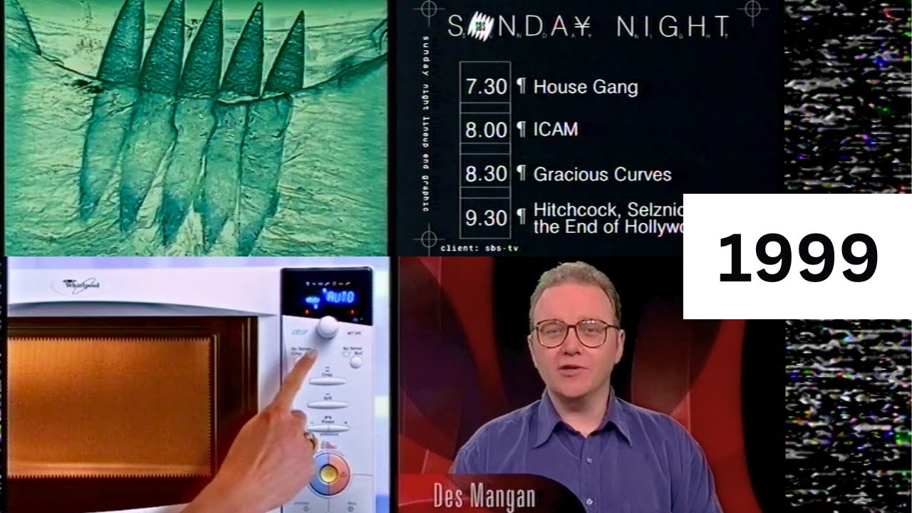 1999 SBS evening ad break and Des Mangan’s Cult Movie introduction, includes SBS idents, promos, Sunday night lineup, Cult Movie intro and Des Mangan introduction to 'Stone’, and Cult Movie Des Mangan conclusion.