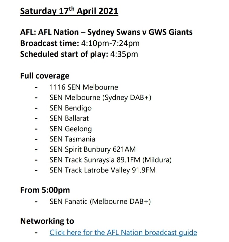 According to the program guide it’s the only game SEN Track Latrobe Valley (and Mildura/Sunraysia) took last round. I wonder if this is because AFL Nation on Gold 1242, Triple M and ABC Gippsland both didn’t take it so it gave SEN Track the rights. It was two interstate teams (GWS and Sydney) so possibly wasn’t broadcast on the other stations in Gippsland.
