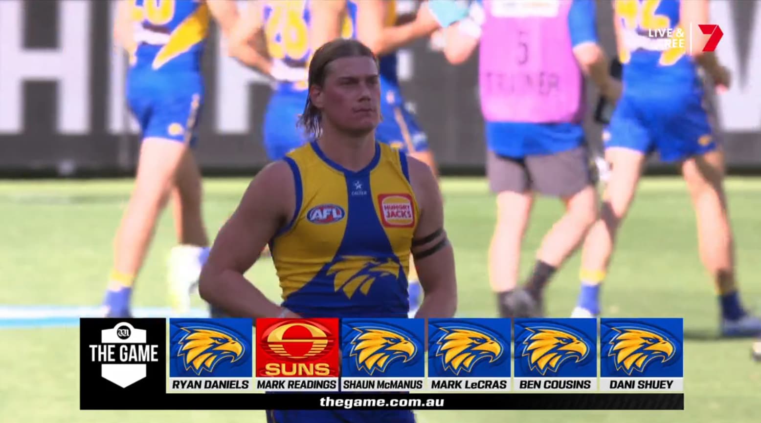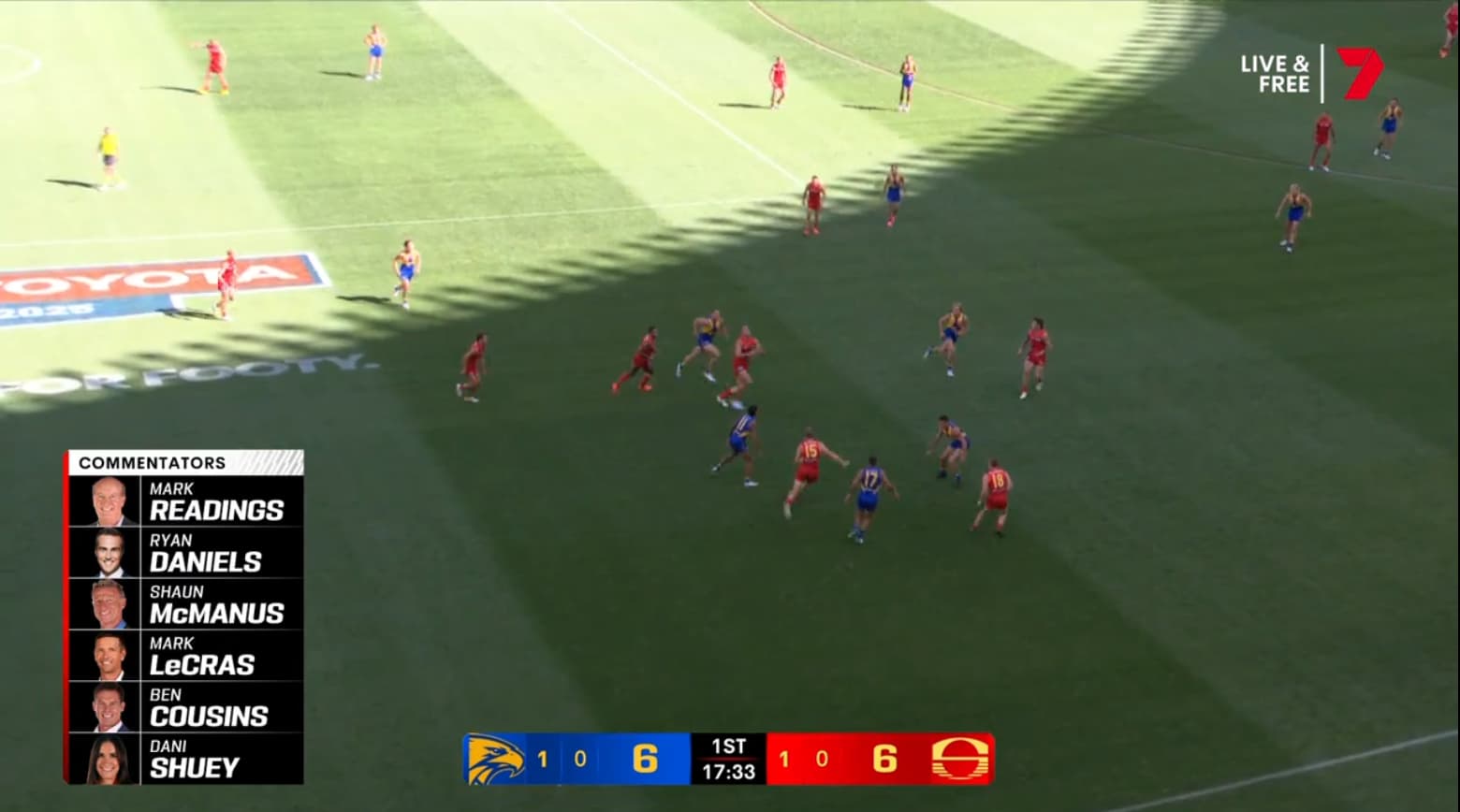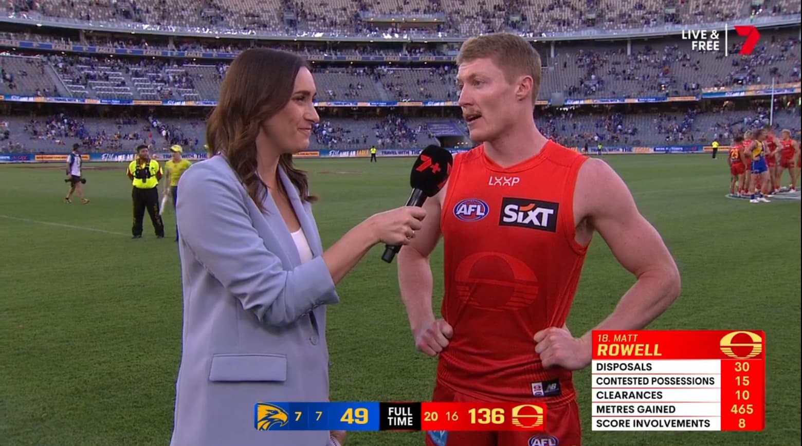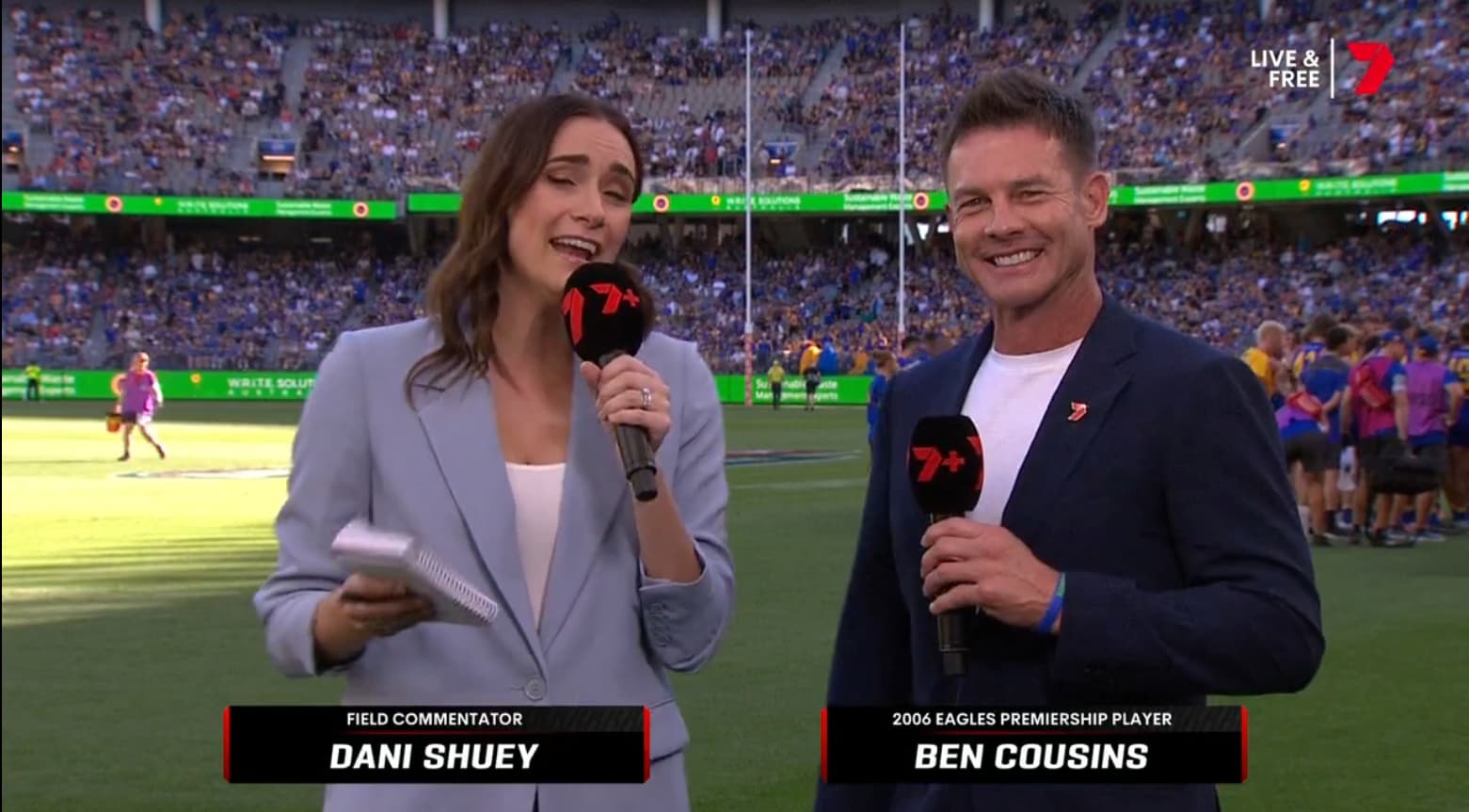 NOTE 2: Yes, the boundary rider - Dani Shuey - is the wife of Norm Smith Medallist and former Eagles captain Luke Shuey. She has a sporting media presence in WA as she is one of the presenters of Seven’s 4WD Adventure Show, is a member of Triple M Perth’s Weekend Huddle, and has served as an MC for the 2023 Women’s World Cup matches in Perth, the 3x Matildas matches in Perth in 2023, Perth Wildcats home games, Perth Scorchers BBL and WBBL home games, and Cricket Australia matches at Optus Stadium and the WACA Ground.