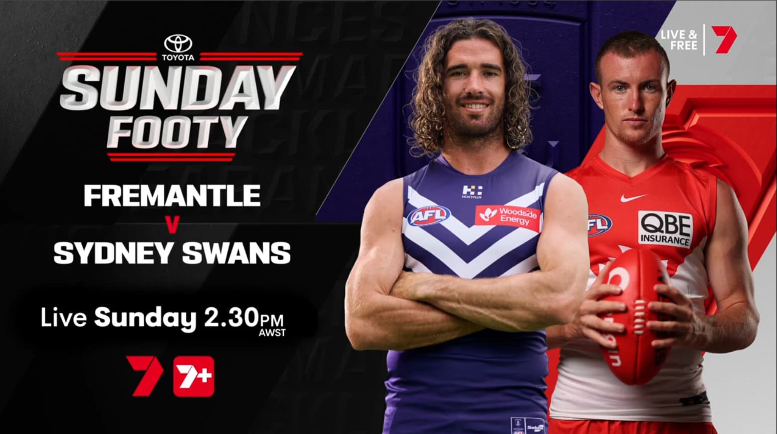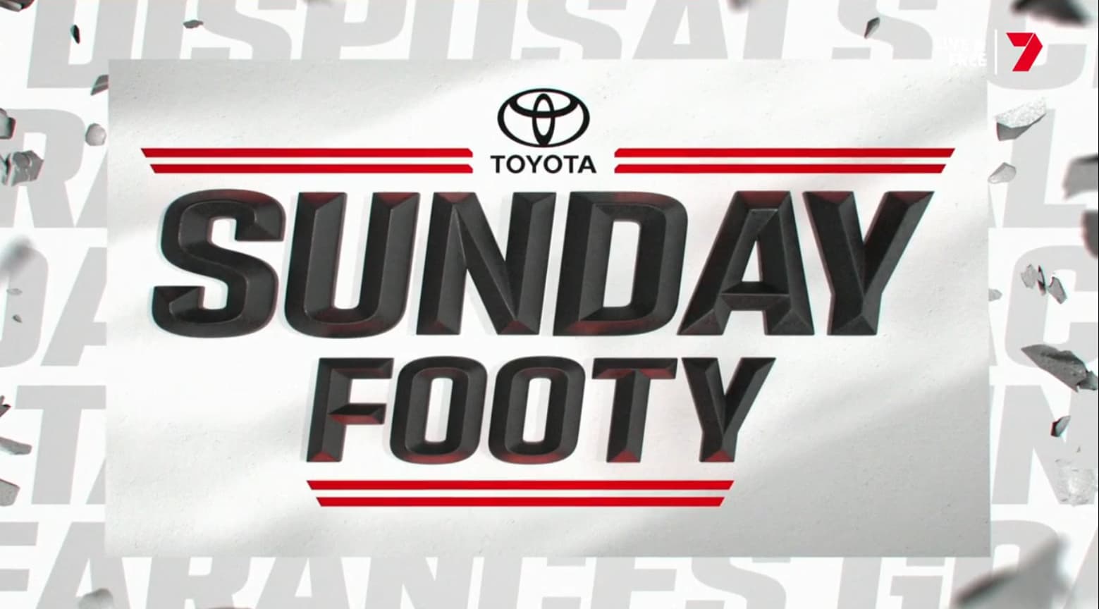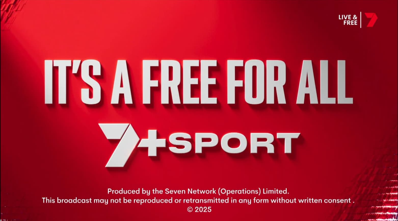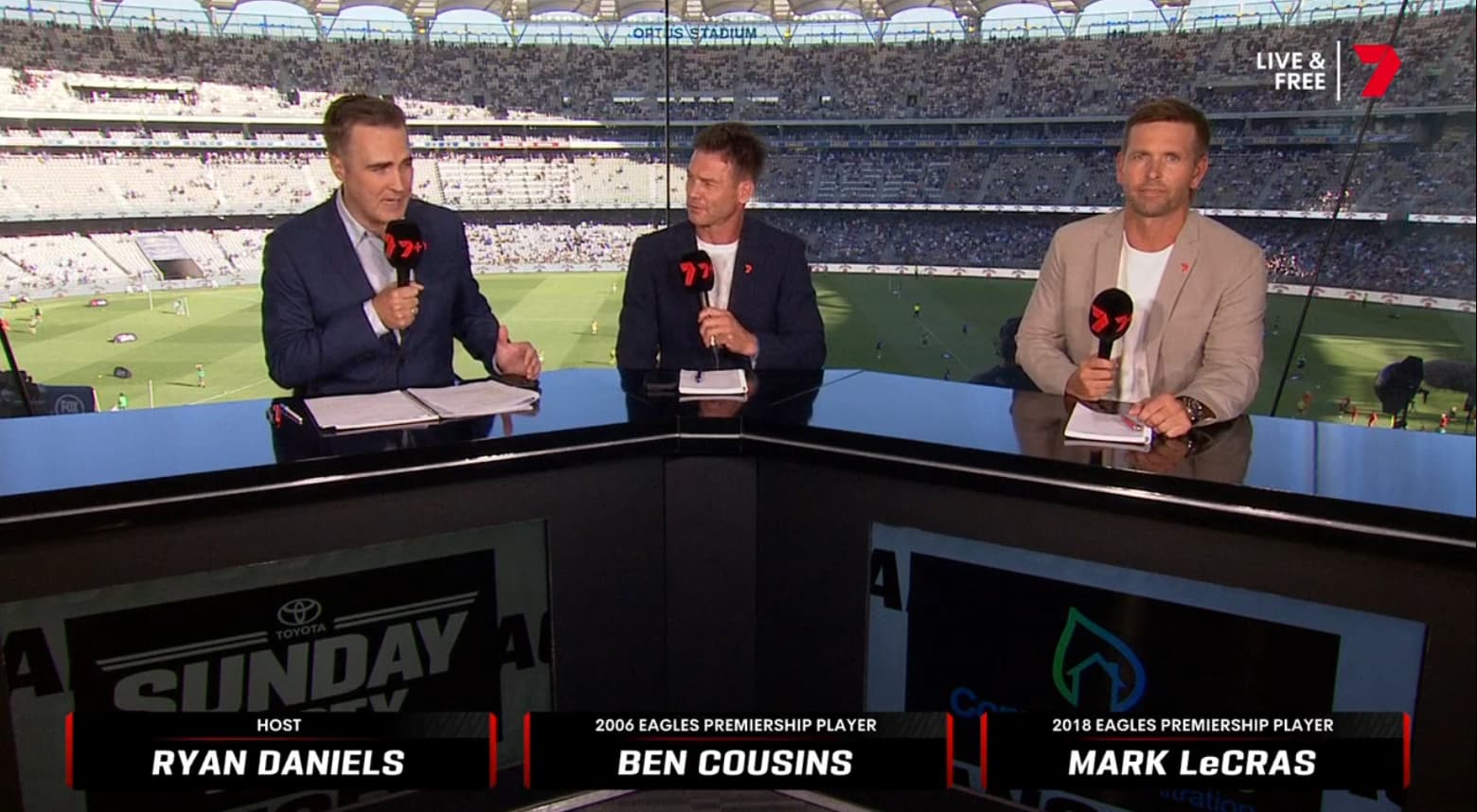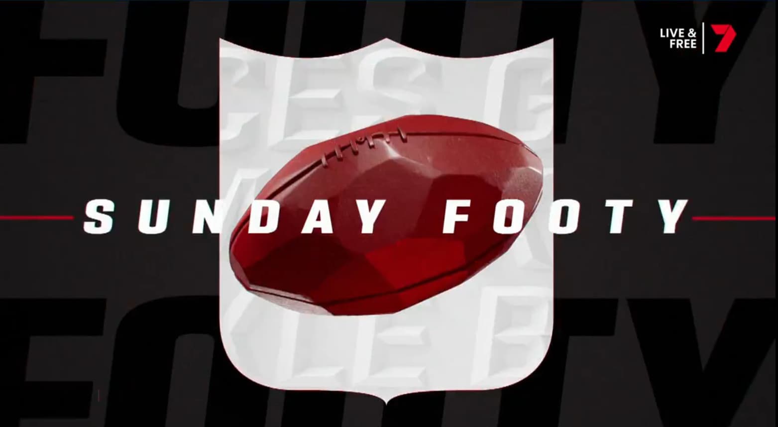 NOTE: The interview by Kath Loughnan with Andrew McQualter, featuring the non-Fox-branded Sunday Ticket mic was not carried by the Seven broadcast. It was a production slip-up and was shown onscreen without the interview’s audio, rather the commentators talking over it about their tips for the game.