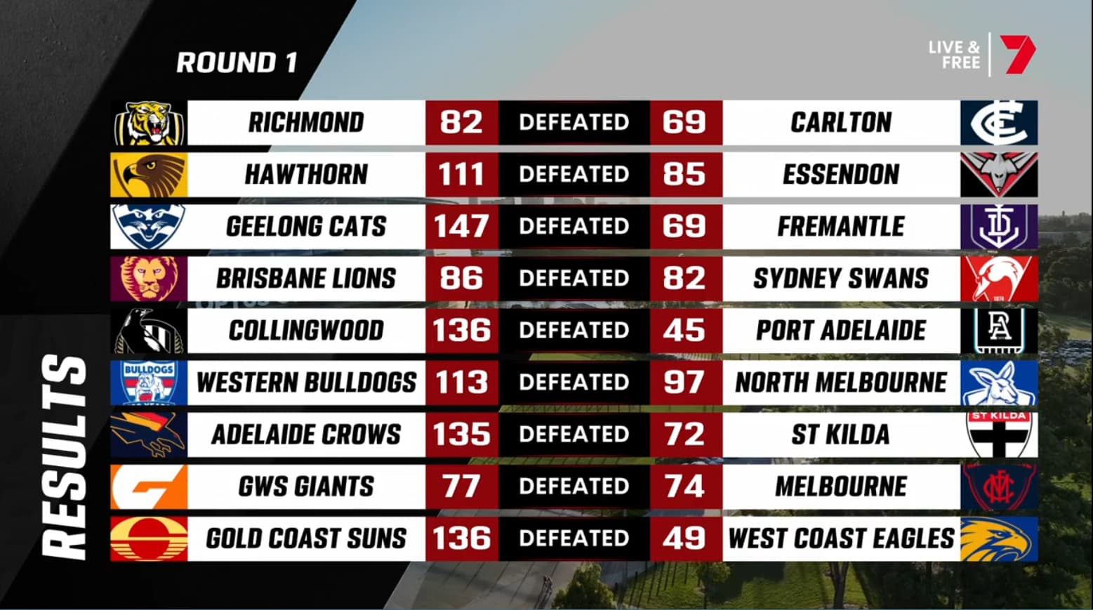 And the first 16 lack of Saturdays became either Thursdays or Sundays for Seven. Some of the Sundays are also nights. Seven also get marquee like Opening, Anzac Eve, Day, DreamTime and King’s Birthday, plus finals.