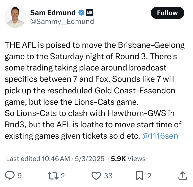 Sounds like the lawyers didnât include a clause for broadcasting of postponed/rescheduled games. It will be disappointing if the Lions-Cats isnât shown on FTA as a result of the rescheduling but it is what it is. Although if the AFL wanted to they could just designate it a âmarquee matchâ which it was originally going to be anyway, meaning Seven could broadcast it whenever.