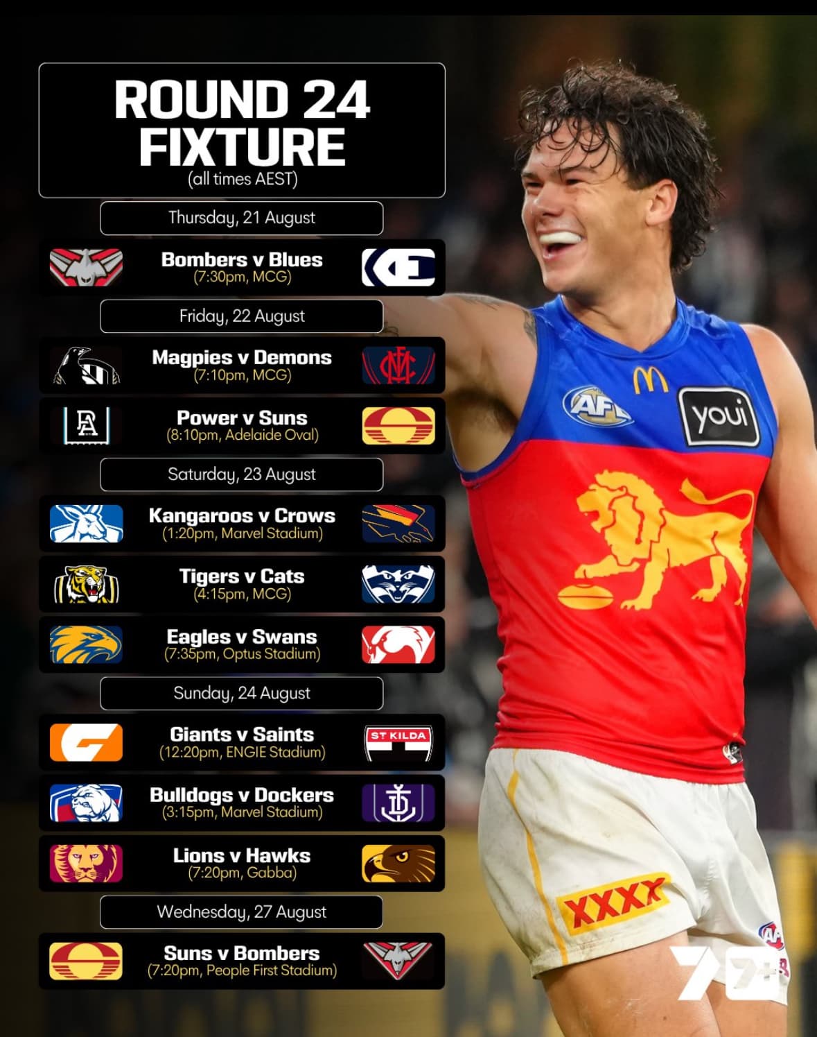 The Seven Network welcomes the AFL’s fixture announcement for Round 24 of the 2025 AFL Premiership Season, to be broadcast live and free on Seven and 7plus Sport.
