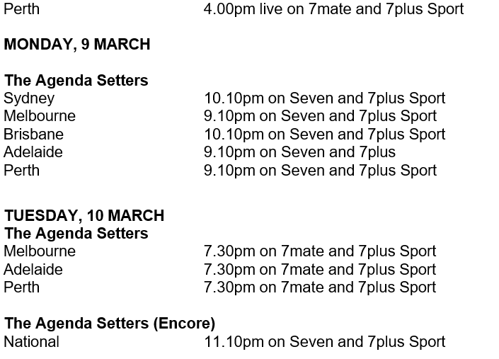 The Agenda Setters –Tuesday nights on 7mate and 7plus Sport Returns Tuesday, 10 March