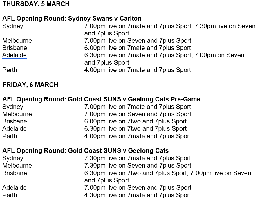 The Seven Network’s full slate of weekly AFL programming is set to get back into action as the highly anticipated 2026 AFL Premiership Season returns, with the Sydney Swans v Carlton blockbuster kicking off the season at the SCG this Thursday, 5 March, live and free from 7.00pm AEDT on Seven, 7mate and 7plus Sport.