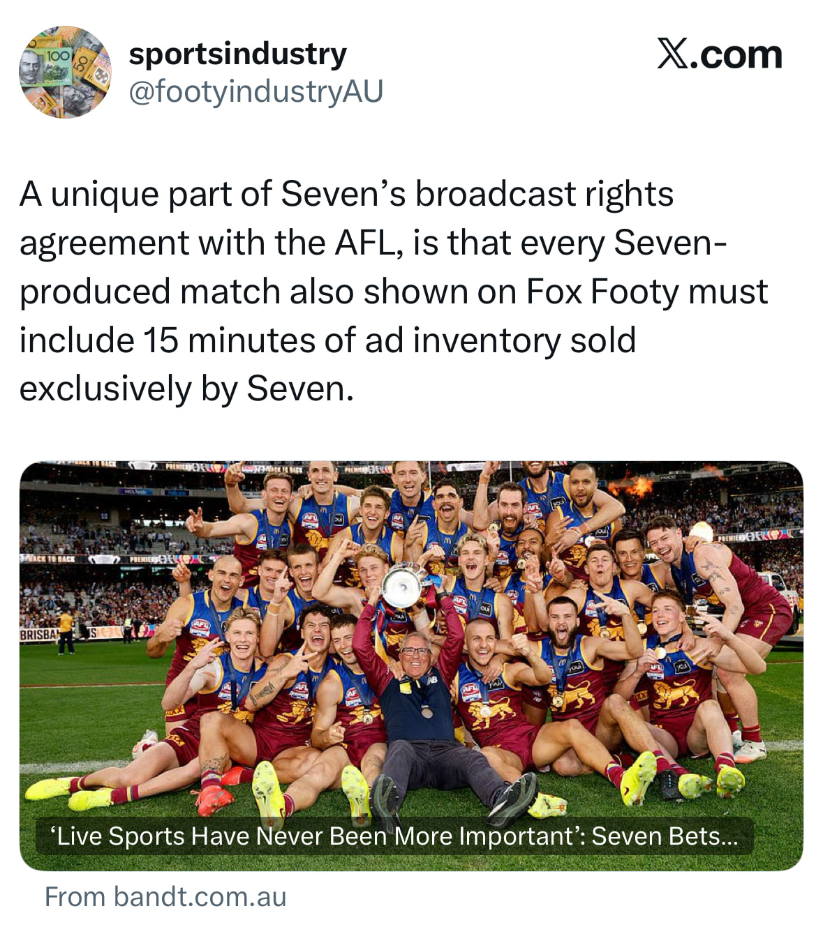 âSevenâs record-breaking summer of cricket â with the highest-rated Ashes Test series ever on Seven and the biggest Big Bash League audience in six years â means we arrive at AFL 2026 with extraordinary momentum across our 52-week sports line up. Live sport has never been more valuable for Australians or for brands,â she said.