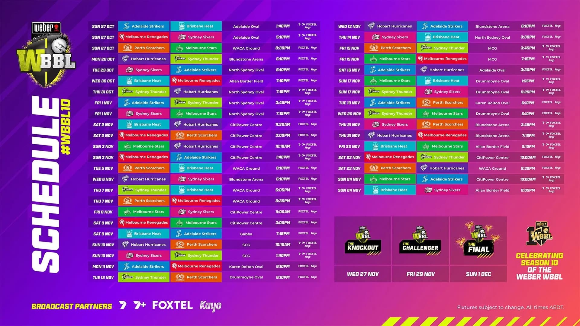 Cricket Australia announced the WBBL|10 fixture this morning. Seven’s coverage begins with the doubleheader at Adelaide Oval on Sunday, October 27. Seven will show 23 matches including all finals, all of which will be streamed live on 7plus for the first time, as part of the network’s new broadcast deal.