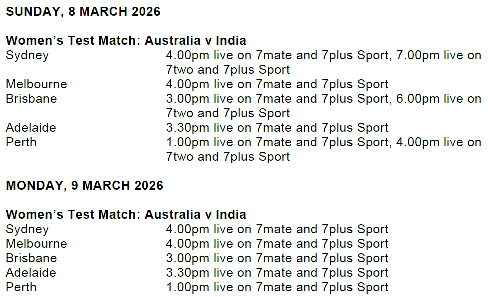The match will commence on Friday, 6 March, from 3.30pm AEDT, with coverage to start on the remaining days from 4.00pm AEDT.