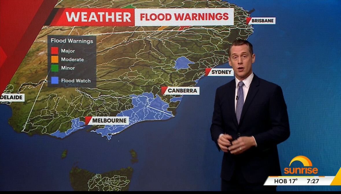 The graphics should be full screen so it does not have to be downsized to fit the presenter so you can read more easily the temperatures and as thus you can also fit more temperatures on the screen. I used to like the fly bys they used to do instead of having cluttered maps which look dreadful and are hard to read. While that map isn’t cluttered if you look at the 6pm Sydney weather graphics you see what I mean not to mention they have put certain localities in the wrong spot on the map in space available. Which annoys me