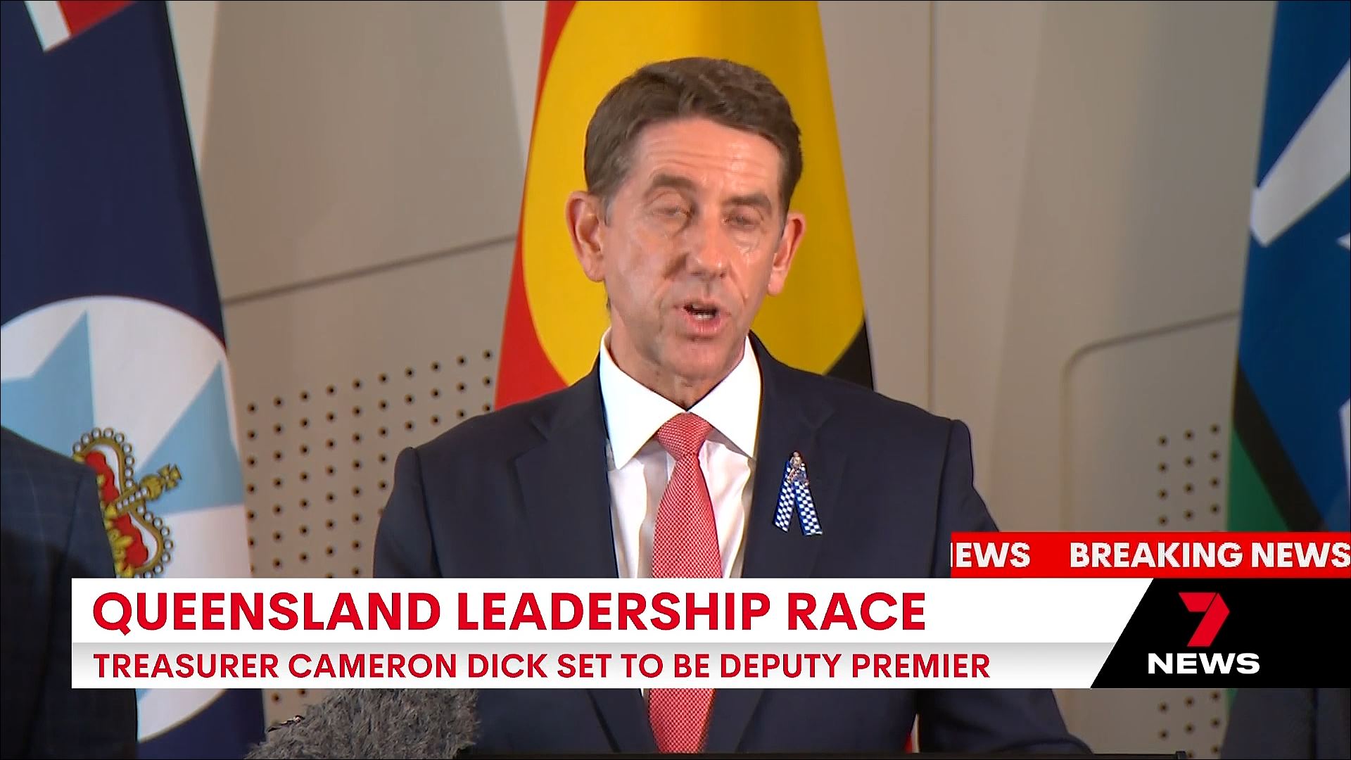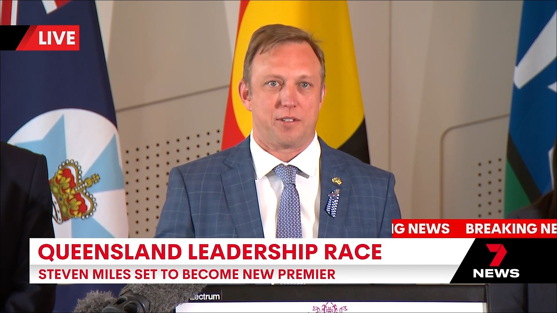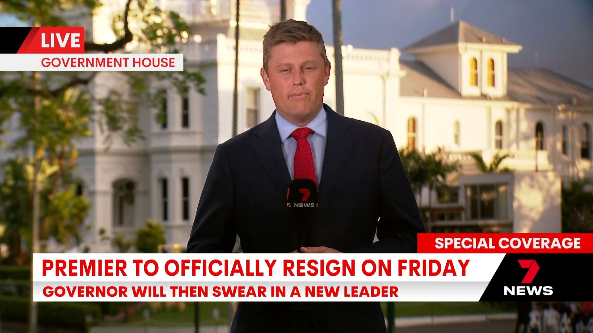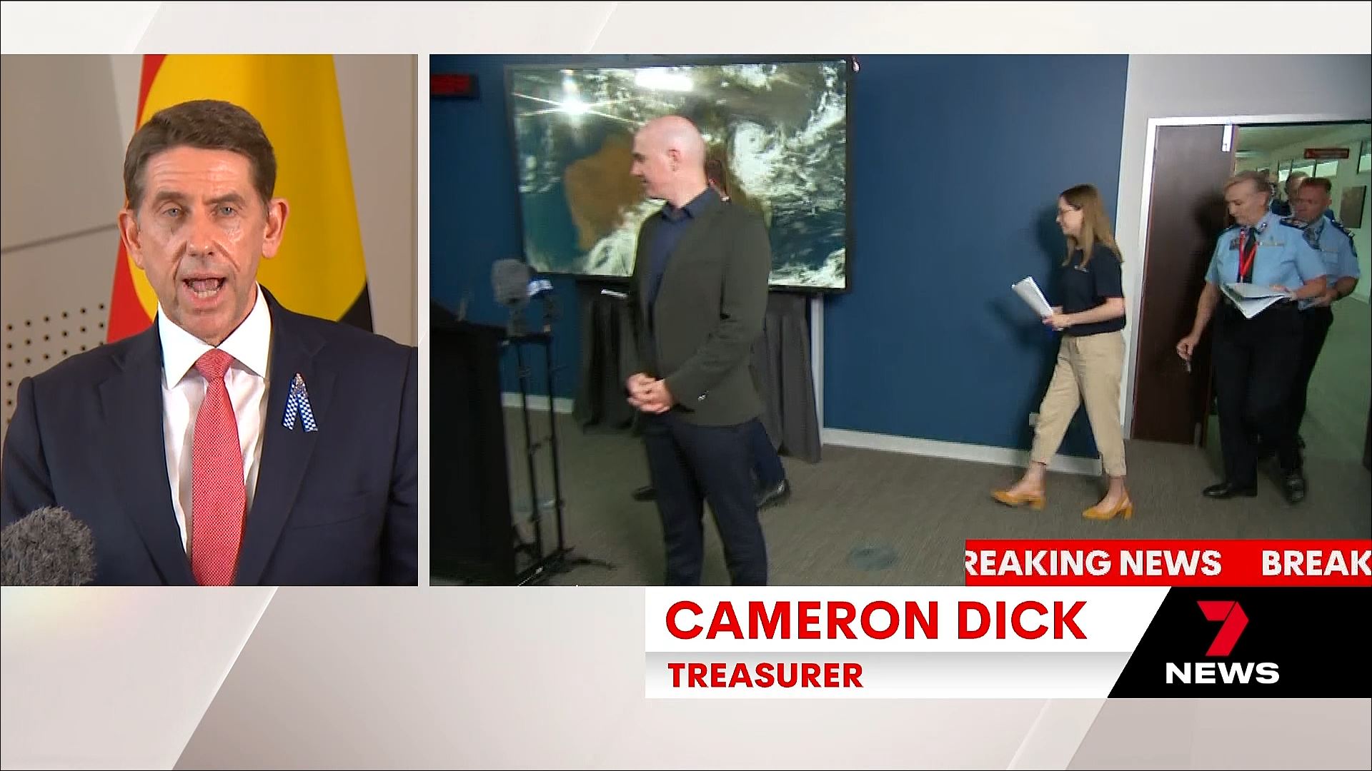 Seven Brisbane broke into programming (morning news) for a media conference on the cyclone (despite the caption). “Some of you will be interested in other matters”. It turned into formal announcements for leadership of the party.