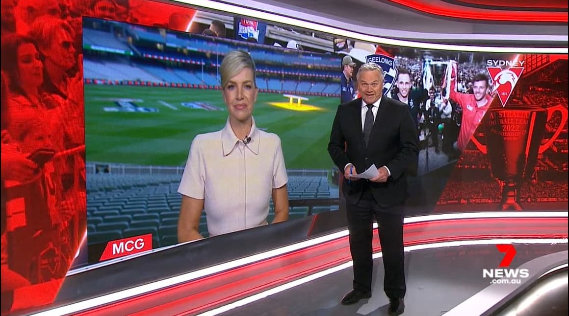 Notice that Seven News Sydney had its own crew at the MCG, with Mel McLaughlin presenting sport from top level of Ponsford Stand and reporter Tom Sacre in the Swans team rooms.