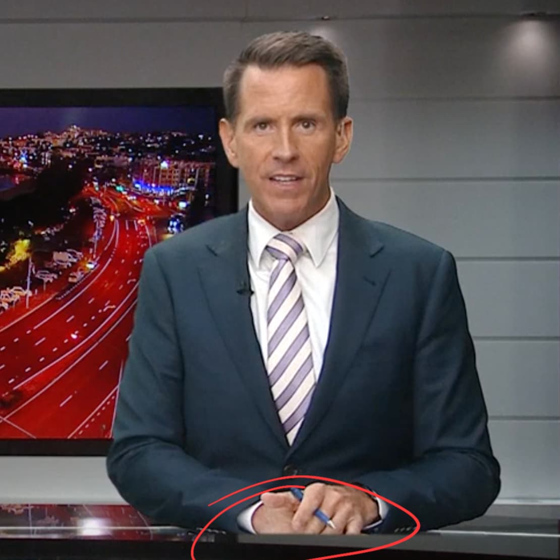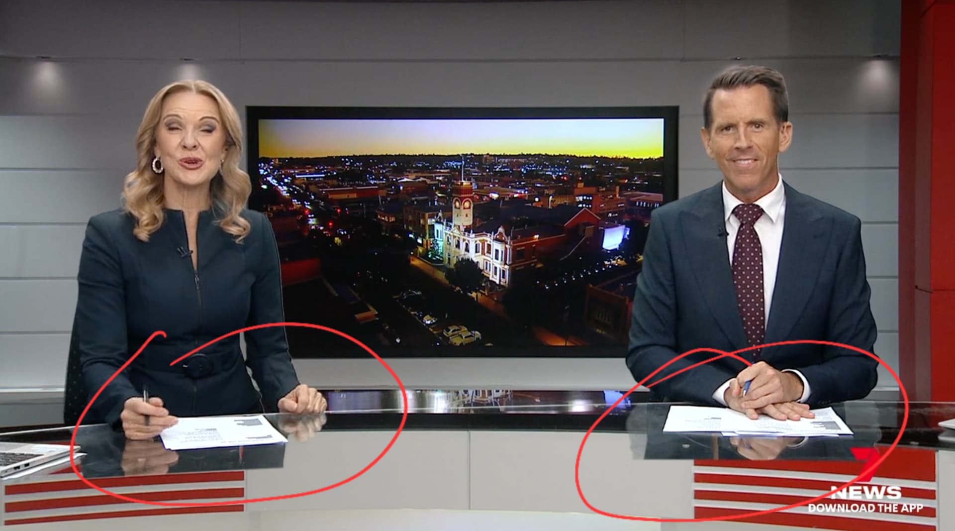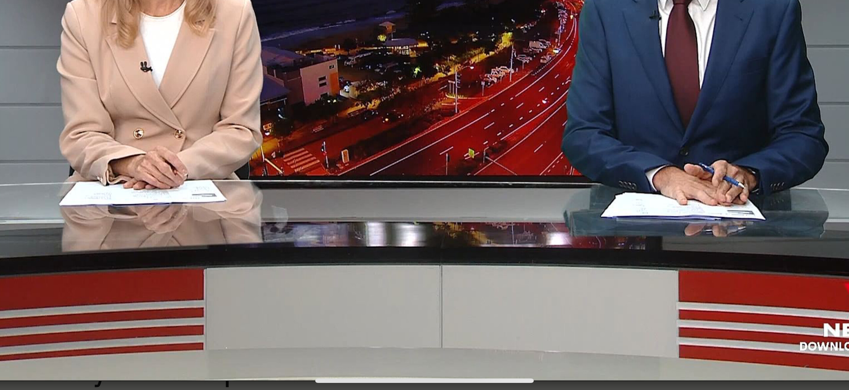Probably explains why all of a sudden the presenters are sitting in front of the “desk” seen at the start of the bulletin (i.e. photo/loop of the set was already recroded).