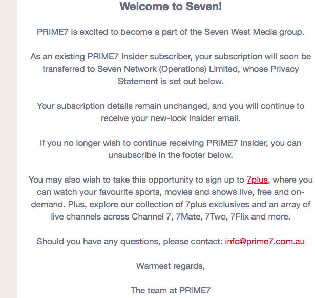 It feels like a lot of the changes have occurred on Wednesday. Today, they transferred our email addresses from Prime7 insider to Seven. 7mate HD launched last Wednesday. The prior Wednesday saw the seven brand introduced on air, except for the news. Who knows what will happen next Wednesday.