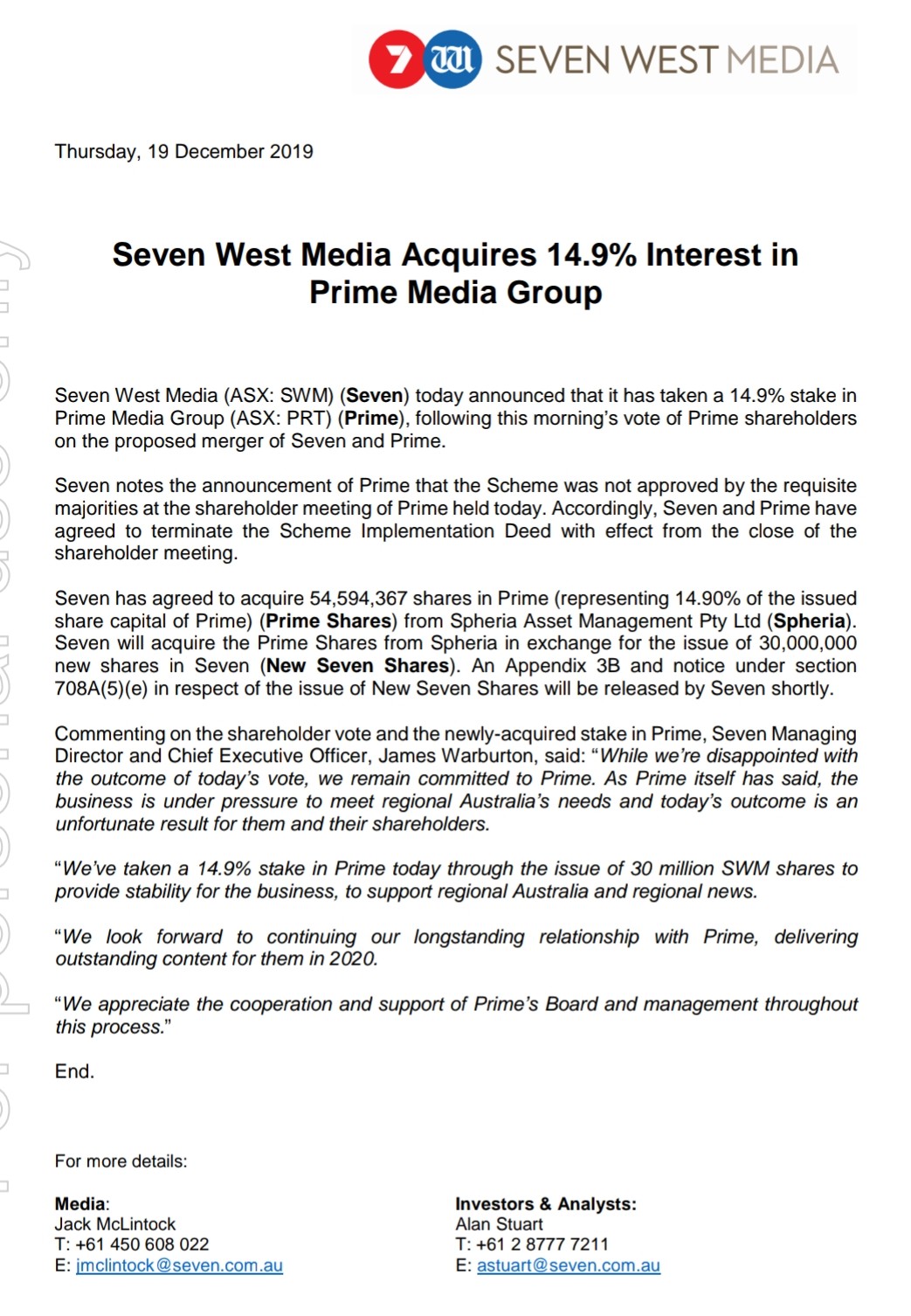 Should the merger not go ahead, Prime & Seven will consult in accordance with the terms of the Scheme Implementation Deed from when the merger proposal was first announced in October.