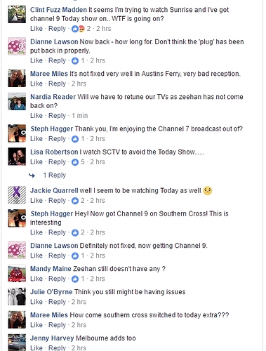 There was reports on Southern Cross Tasmania’s Facebook page that the channel had been showing Today instead of Sunrise on the 7 based SCTV channel and also was showing 7mate at one point on the main channel.