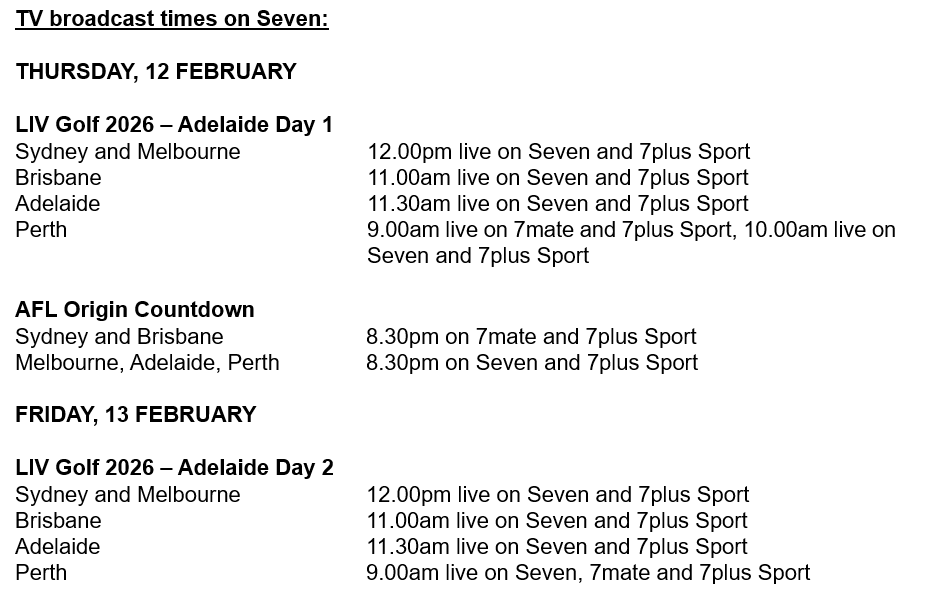 Seven’s unmissable weekend of sport begins with LIV Golf Adelaide, live and free from 12:00pm AEDT today and running across four days on Seven, 7mate and 7plus Sport.