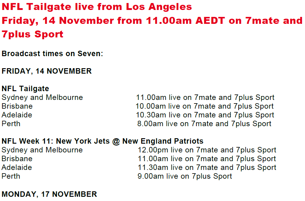 The excitement continues following NFL Tailgate with the New York Jets facing the New England Patriots from midday AEDT on 14 November, live and free on 7mate and 7plus Sport.