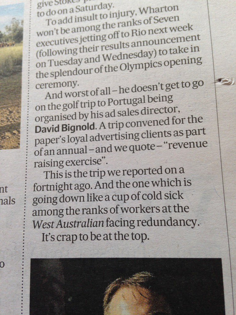 Chris Wharton has had to find $10 million in savings at The West Australian, meanwhile other Seven executives will be in Rio for the Olympics. And as Stephen Mayne linked to, Seven is funding a golfing junket in Portugal for The West Australian’s advertising clients.
