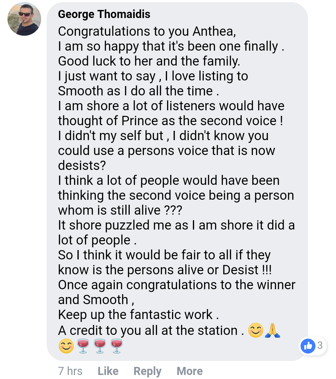 The Smooth Stars $117,000 jackpot went off this morning with a listener correctly identifying Prince as the second voice. On Facebook a commenter is alleging that Smooth manipulated the recording of Prince to make his voice sound deeper than it actually was, and another is pointing out that most people would have assumed that all four voices in the I Love Smooth FM phrase were of stars who are still alive. Using an alleged manipulated recording of a deceased person could be the reason there was a big jackpot?