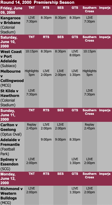 Round 14, 2000 TV times to go with the '98 and '99 ones I posted a few months ago. Includes C7 coverage from the Sunday to the following Friday.