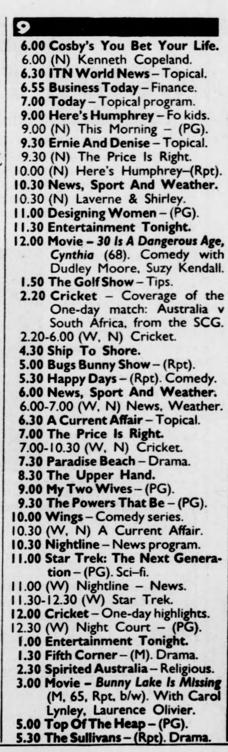 Both NBN and WIN delayed ACA until after the cricket, as the game was at the SCG, back then Nine could only show the first 2 hours of the ODI in the host city. Also includes the replacement programming for TCN-9 from 4.30pm as well.