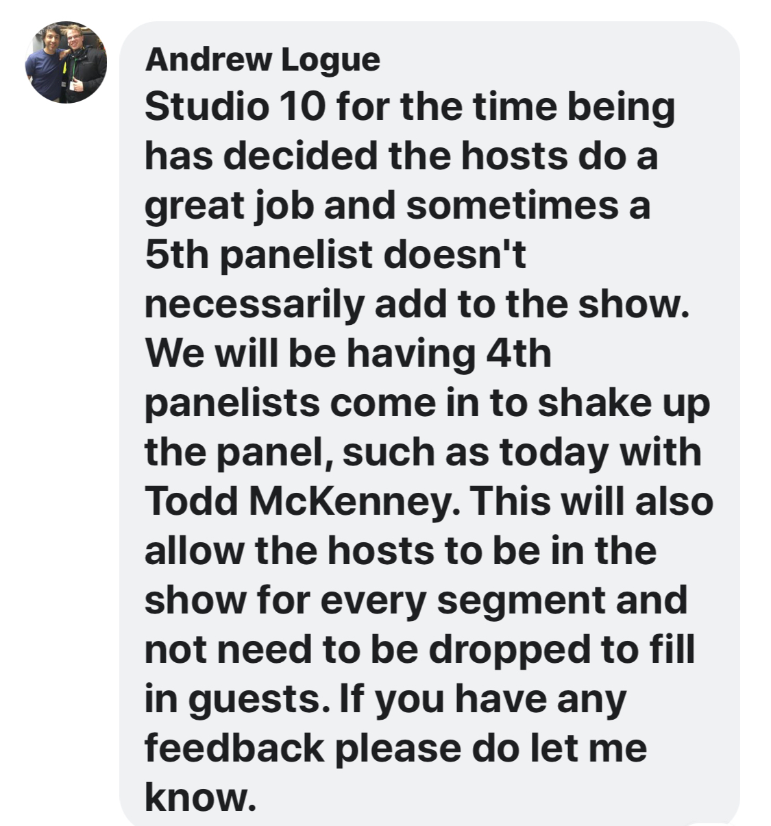 I would, though, move Jess to the far right of the desk, and have her current seat the rotating panellist.