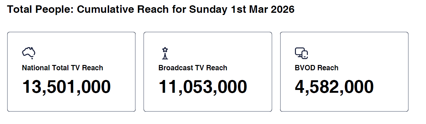 Data © OzTAM Pty Limited 2026. The Data may not be reproduced, published or communicated (electronically or in hard copy) in whole or in part, without the prior written consent of OzTAM.