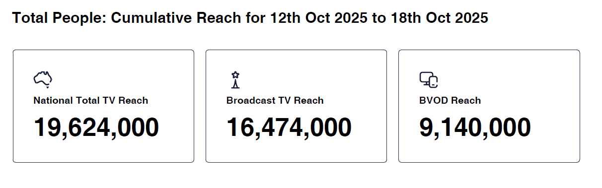 Data © OzTAM Pty Limited 2025. The Data may not be reproduced, published or communicated (electronically or in hard copy) in whole or in part, without the prior written consent of OzTAM.