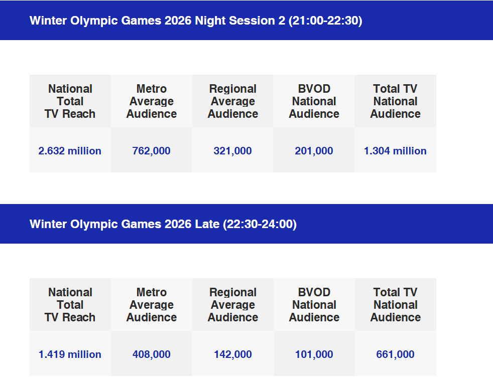 | 2 | WINTER OLYMPICS 2026 D9 -NIGHT SESSION 2 | Nine | 2,632,000 | 1,304,000 | 201,000 |