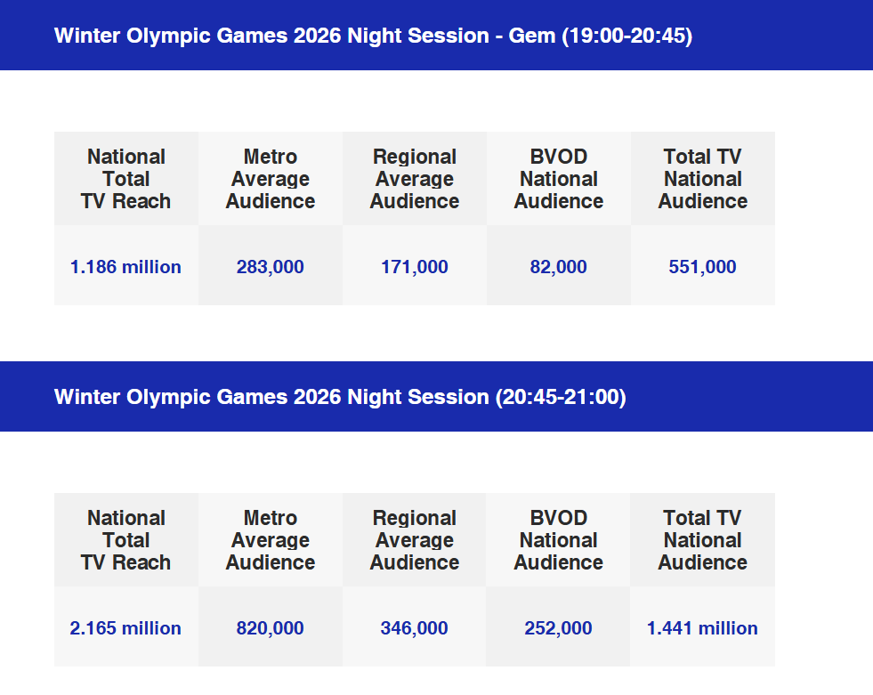 | 2 | WINTER OLYMPICS 2026 D9 -NIGHT SESSION 2 | Nine | 1,052,000 | 507,000 | 113,000 |