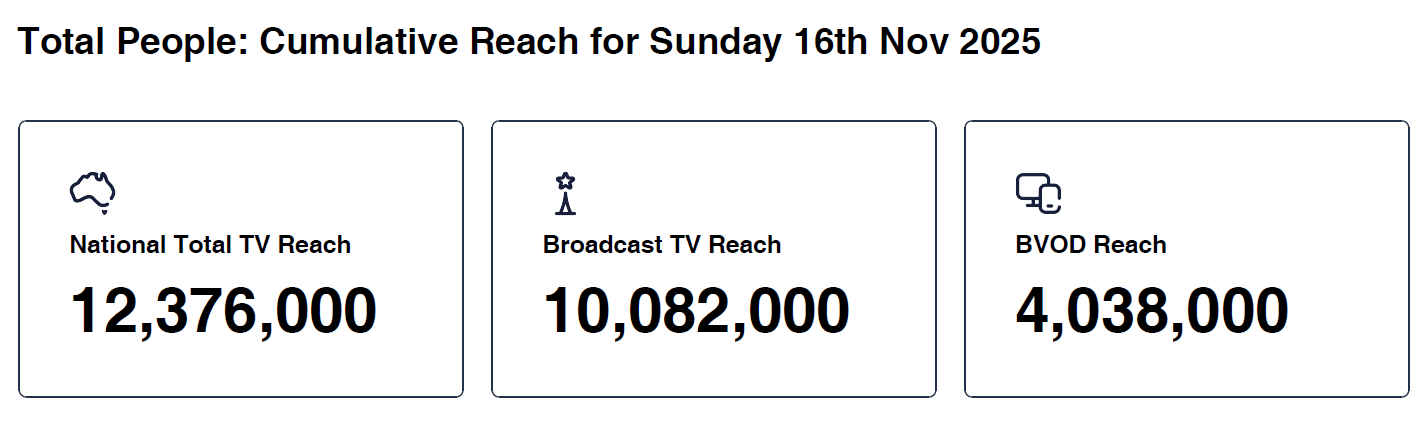 9News Sunday was the No. 1 news program across the 5 City Metro with People 25-54, 16-39 and Shoppers 18+. It achieved a National Total TV Reach of 1.856 million , a Total TV National Audience of 1.185 million (up 6.5% year-on-year) and a BVOD Audience of 141,000 (up a massive 78.5% year-on-year).