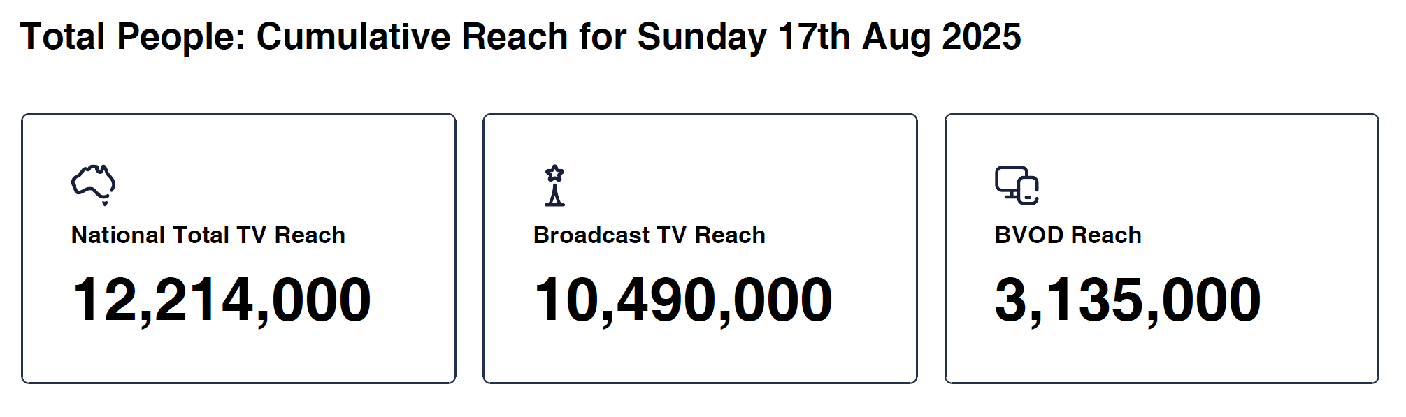 Seven Network reaches 5.9 million Australians nationally. 7plus: reach up 25.3% year-on-year. 7NEWS Sunday: National reach 2.22 million, national audience 1.41 million. The Voice Sunday**:** National reach 2.08 million, national audience 987,000. 7NEWS Spotlight: National reach 1.38 million, national audience 769,000. Seven’s AFL: Sunday Afternoon Football: #1 sport. National reach 1.14 million, national audience 380,000. Weekend Sunrise Sunday: #1 breakfast program. National reach 853,000, national audience 351,000. 32% more viewers than Today.