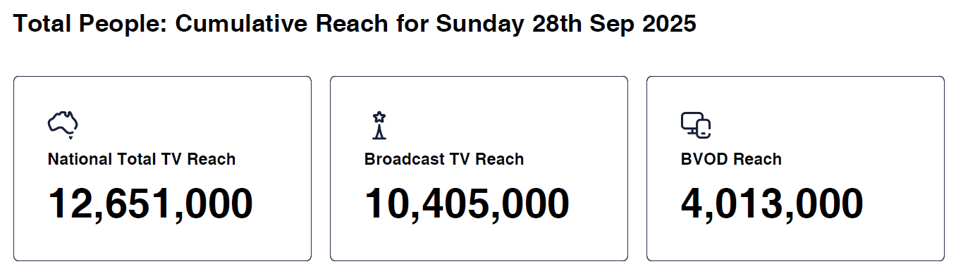 NRL Live Final Series Broncos v Panthers was the No. 1 program of the day across Australia with People 25-54 and 16-39. It was also the No. 1 program of the day in Sydney and Brisbane with Total People and all key demos. It recorded a National Total TV Reach of 3.113 million, a Total TV National Audience of 1.764 million and a BVOD Audience of 429,000.