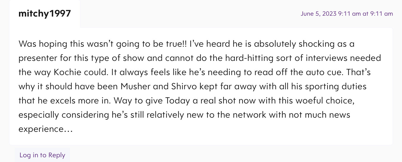 Shirvo’s appointment is one of those things, like everyone else has said is a safe move for Sunrise, appoint the most relevant fill-in presenter the show has, but I do agree that he isn’t really a serious news kind of guy. Hopefully with the guidance of Nat and everyone else, he can become one.